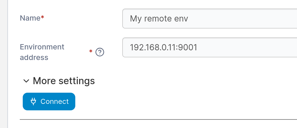 Once you are done, add a name for your remote environment and the connection address, including the port and click Connect: